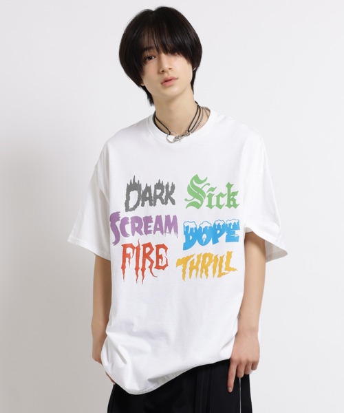 MILKBOY 2026 SPRING ・「DARK」「SICK」「SCREAM」「DOPE」「FIRE」「THRILL」など、エッジの効いた単語をマルチカラーで表現したグラフィックTシャツ ・それぞれ異なるテイストのフォントで構成されており、単色ボディに映えるカラフルでインパクトのあるデザインが、コーディネートのアクセントに◎ ~ Colors ~ A,ホワイト B,セーフティーグリーン C,ブラック ~ Size ~ M : 身幅 56㎝ / 着丈 75㎝ L : 身幅 66㎝ / 着丈 79㎝ ~ Material ~ A/C:綿100% B:綿50% ポリエステル50%