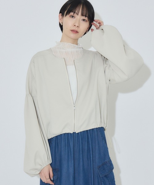 気分に合わせてフォルムを変える 軽やかに纏うボリューム袖ブルゾン <POINT> 空気を含んだような柔らかなフォルムが目を惹く、大人のためのショートブルゾン。 裾のドロストで、愛らしい丸みのあるシルエットからハンサムな裾広がりまで、その日の気分に合わせた着こなしを楽しめます。 【デザイン・シルエット】 袖のギャザーとゴム入りの袖口が、立体的なボリュームスリーブを構築。 ゆったりとした身幅ながら、サイドの切り替えが視覚的なスッキリ感をプラス。 ノーカラーの首元が顔周りをシャープに見せ、お出かけスタイルを品良く整えます。 【素材感】 軽やかで、さらりとした肌触りと、適度なハリ感があるため、ふんわりとした立体的なシルエットを美しくキープします。 重さを感じさせない軽快な着心地で、季節の変わり目のお出かけに重宝する一枚です。 【カラー】 ブラック ベージュ 2色展開 【スタイリング】 重心を高く見せるショート丈は、ハイウエストのパンツやナロースカートと好相性。 フロントジップを少し開けて襟元を抜くことで、こなれ感たっぷりの装いに。 ドロストを強めに絞り、ボリュームのあるフレアスカートと合わせたメリハリのある着こなしも、今の気分にぴったりです。 裏地:なし 光沢:なし 伸縮性:なし 透け感:なし 生地の厚さ:普通 ポケット:なし ※照明の都合上、多少の色ブレが生じてしまう可能性がございますので、予めご了承くださいますようお願い致します。 --------------------------------------------------- ●お気に入り登録でお得情報を手に入れよう! 「商品のお気に入り登録」をすると、再入荷通知や、ラスト1点の通知、セールの通知など、お得情報が届きます。 また、マイページでいつでも確認が可能になります。 「ブランドのお気に入り登録」をすると、新商品や再入荷、などいち早くブランドの最新情報をお届けします。 ぜひ、ご利用ください。 ----------------------------------------------------