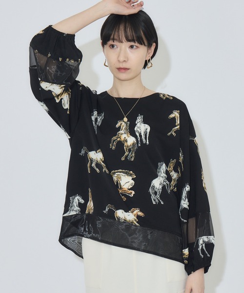 クラシックな柄を軽やかに シアー切替の映えブラウス <POINT> クラシックなホースプリントに、繊細なシアー素材を巧みに組み合わせた贅沢なデザイン。 袖の一部や裾から覗く柔らかな透け感が、重くなりがちな総柄ブラウスに軽やかなリズムと抜け感をプラスしてくれます。 【デザイン・シルエット】 ゆったりとしたリラクシーなシルエットながら、裾の前後差が腰回りをすっきりとカバー。 袖口にゴムを配したボリュームスリーブが、動くたびにふんわりと優雅なフォルムを描きます。 後ろ襟のハーフジップがバックスタイルのアクセントになり、着脱のしやすさとデザイン性を両立させたこだわりの一着です。 【素材感】 さらりとした滑らかな肌触りのポリエステル素材を採用。 シアー部分との異素材コントラストが、ワントーンでは出せない奥行きのある表情を生み出します。 軽快な着心地で、長時間のお出かけでも美しさをキープできるのが魅力です。 【カラー】 アイボリー ブラック 2色展開 【スタイリング】 ブラウスのデザイン性を活かし、シンプルなスラックスやタイトスカートを合わせるだけで洗練された装いが完成。 袖を軽くまくってボリュームを強調し、手元にゴールドのアクセサリーを添えれば、よりクラス感のあるお出かけスタイルに。 裏地:なし 光沢:別布部分あり 伸縮性:なし 透け感:別布部分あり 生地の厚さ:薄手 ポケット:なし ※照明の都合上、多少の色ブレが生じてしまう可能性がございますので、予めご了承くださいますようお願い致します。 ※こちらの商品は畳まれた状態で納品されます。着用の前にスチームアイロンなどでアイロンがけをおすすめします。 --------------------------------------------------- ●お気に入り登録でお得情報を手に入れよう! 「商品のお気に入り登録」をすると、再入荷通知や、ラスト1点の通知、セールの通知など、お得情報が届きます。 また、マイページでいつでも確認が可能になります。 「ブランドのお気に入り登録」をすると、新商品や再入荷、などいち早くブランドの最新情報をお届けします。 ぜひ、ご利用ください。 ----------------------------------------------------