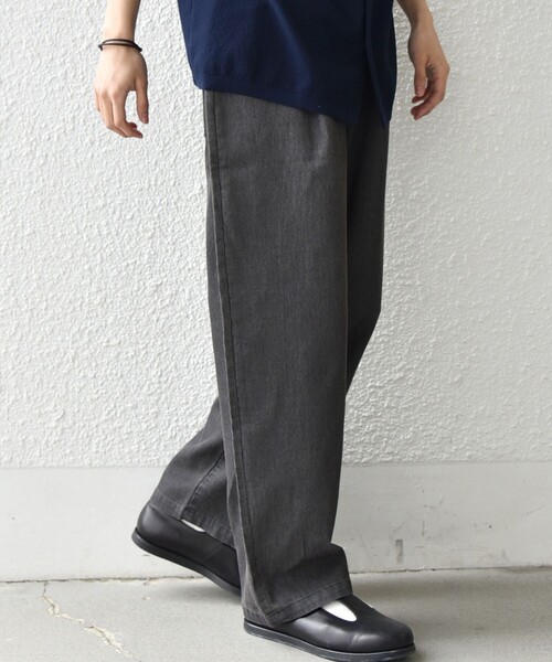 デニムライクな表情が◎暑い季節に穿きやすいメッシュデニム使用のワイドパンツ 【素材特性】 デニムライクな表情をキープしながら、メッシュ構造による通気性の良さも兼ね備えた素材を使用。 パナマ織の生地を採用しており、軽量でデニムのような風合いに仕上げました。 ポリエステル混のため通常のデニムよりも汗によるベタつきが少なく、暑い季節でも快適に着用いただけます。 【デザイン】 見た目はしっかりデニムながら、春夏シーズンも快適に穿けるパンツ。 1タックデザインのリラックス感があるシルエットで、カジュアルにもきれいめにも馴染むアイテムです。 両サイドにポケットを配し、実用性も確保。 シンプルなTシャツやスニーカーと合わせることで、大人のカジュアルコーデが完成します。 同素材のテーパードパンツやジャケットの展開もありますので、お好みでセットアップとしての着用もおすすめです! 【同素材アイテムはこちら】 ◆ライト メッシュ デニム テーパード パンツ(セットアップ対応) 713-13-0056 ◆ライト メッシュ デニム リラックス ジャケット(セットアップ対応) 714-03-0013 ※モールサイトによって(ハイフン/-)抜きでの品番表記となります。 ---------------------------- 裏地:無 光沢感:無 生地の厚み:薄手 伸縮性:やや有 透け感:無 水洗い:洗濯機可能 ---------------------------- 【注意事項】 ※末永く愛用頂く為に、アテンションタグ・洗濯ネームを必ずご確認の上、着用又はお取り扱いください。 ※撮影環境による光の当たり具合やパソコン・スマートフォンなどの閲覧環境によって、実際の色味と異なって見える場合があります。 ※画像の商品はサンプルです。 実際の商品と仕様、加工、サイズが若干異なる場合がございます。