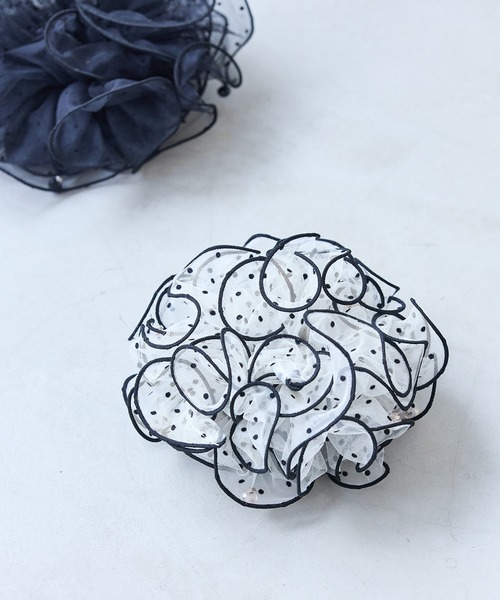 【2026 Spring/Summer】【26SS】 <POINT> ・たっぷりとしたフリルが目を引くボリュームシュシュ ・コーディネートのアクセントになる華やかなデザイン ・まとめ髪にさっと付けるだけでヘアアレンジが完成 【デザイン・シルエット】 たっぷりとしたフリルで立体感のあるシルエットに仕上げたシュシュ。先端で揺れるビーズがさりげないアクセントになり、動くたびにきらっと輝くデザインです。まとめ髪に付けるだけで華やかな印象をプラスしてくれます。軽やかな素材感で春夏のスタイリングにも取り入れやすく、大人フェミニンな雰囲気を演出してくれるアイテムです。 【カラー】 ブラック、ホワイトの2色展開。 【おすすめのスタイリング】 ポニーテールやお団子ヘアなどのまとめ髪に付けるだけで、簡単に華やかなヘアアレンジが完成。手首に付けてコーディネートのアクセントとして取り入れるのもおすすめです。 ※画像の商品はサンプルです。 実際の商品と仕様、加工、サイズが若干異なる場合がございます。