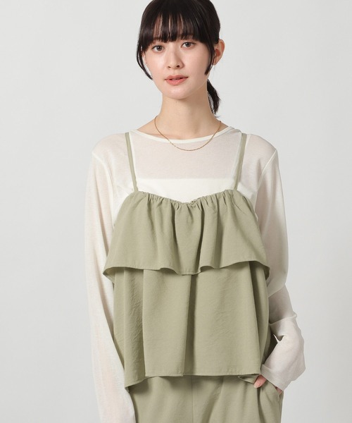 ボリュームのあるフリルデザインが特徴のキャミソール。 身頃のフリルにボリュームがありながらも、キャミソールデザインなので華奢な印象の1枚です。 春夏のレイヤードアイテムとして活躍します。 【素材】 レーヨン混のさらっとした肌触り素材。 多機能付素材で気温の上がる時期にも着やすく、リネンのような素材感が特徴。 [マシンウォッシャブル] ご家庭の洗濯機でお洗いいただけます [クイックドライ] 乾きが速い素材を使用しています [イージーケア] シワが発生しにくい素材を使用しています [UVケア] 生地を透過する紫外線を遮蔽する機能があります [クールフィーリング] 肌に触れた瞬間にひんやりとした感覚を得られ、爽やかに着用いただけます 【スタイリング】 シンプルTシャツやタンクトップなどと相性〇 同素材を使用したボトムとのセットアップスタイルもおすすめです。 ▼同素材のシリーズはこちら・リネンライクシアーWジャケット ブランド品番:657239 ZOZO商品コード:105744633 ・リネンライクイージーパンツ2ブランド品番:657098 ZOZO商品コード:105746231