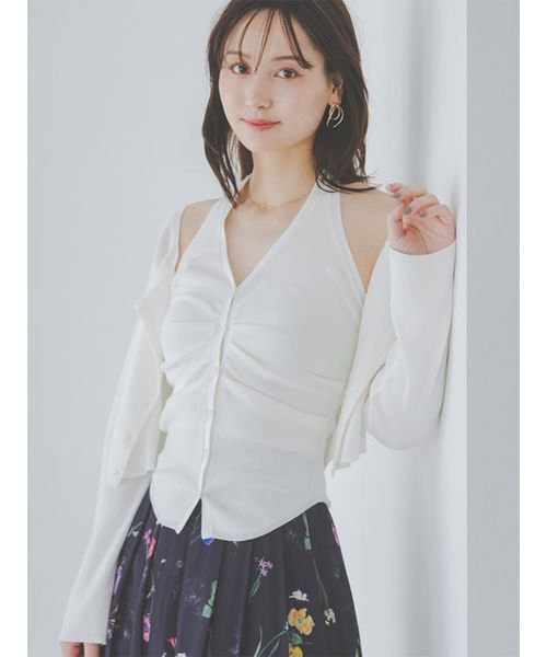 【さまざまなレイヤードを楽しめるホルターネックキャミソール&カーディガンのニットアンサンブル】 【Design/Styling】 ホルターネックのキャミソールとカーディガンがセットになったニットアンサンブルが届きました。深めのV開きでお作りしたフィット感のあるキャミソールは、ボタンを施した前立て位置からサイドにかけてたっぷりとギャザーやタックを入れてドレープ感を出し、ドレッシーな仕上がりに。背中側は華奢なニットストラップで結ぶホルターネック仕様で後ろ姿にも抜かりがないデザインです。カーディガンは広めのスクエアネックでデコルテラインを美しくみせ、クロップド丈でシンプルにお作りしました。それぞれ単品使いにも便利なアイテムです。カーディガンを上にしたアンサンブル着用はもちろん、キャミソールを上にしたレイヤードスタイルもおすすめ。カーディガンは前後を変えてもおしゃれです。さまざまなレイヤードを楽しんでいただけます。 【Fabric】 クリーンなホワイト、濃いめのグレー、まろやかなミントの3色展開です。滑らかなタッチでストレッチ性のある薄手のニット生地を使用しています。 透け感:ややあり 裏地:インナー付属 伸縮性:ややあり 光沢感:なし 生地の厚さ:普通 【おすすめ骨格タイプ】 ■骨格ウェーブ ■骨格ナチュラル ※照明の関係により、実際よりも色味が違って見える場合があります。 またパソコン・スマートフォンなどの環境により、若干製品と画像のカラーが異なる場合もございます。予めご了承ください。 商品の色味は、商品単品画像をご参照下さい。 ※商品画像はサンプルのため、色味やサイズ等の仕様に変更がある場合がございますので、予めご了承ください。