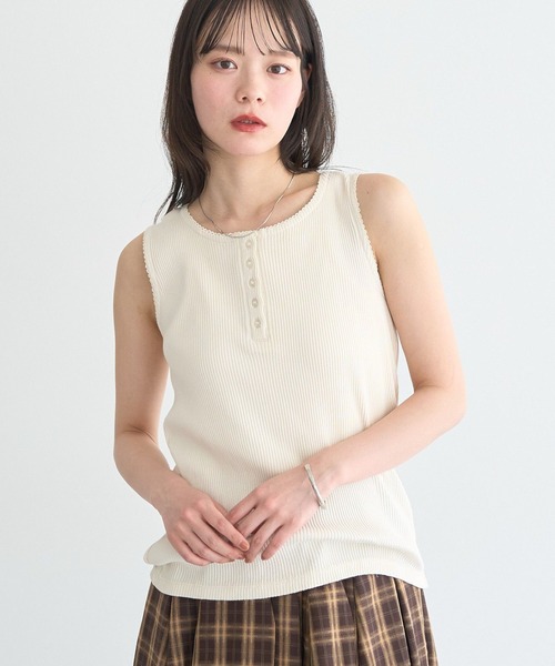定番を可愛く更新するピコミシン。 シンプルなタンクトップにヘンリーネックのデザインを取り入れ、さりげない表情をプラスした一枚です。襟ぐりとアームホールのピコミシンがやさしいアクセントになり、ベーシックながらも女性らしさを引き立てます。 伸縮性のあるリブ素材で動きやすく、デイリー使いにもぴったりです。 ボタンを少し開けて抜け感を出すなど、着こなしのアレンジも楽しめます。 パンツにもスカートにも合わせやすく、カジュアルからきれいめまで幅広いスタイリングに対応できる頼れるトップスです。 透け感[なし] 生地の厚さ[普通] 光沢感[なし] 伸縮性[あり] 裏地[なし] ポケット[なし] ※モデル着用画像は光の当たり具合で色味が違って見える場合がございます。 商品の色味は物撮りの画像をご参照ください。 「私」を、もっと好きになる。 今の時代に寄り添う、 女性らしさをかたちにしたスタイルで、 すべての大人の女性の ときめく毎日を応援します。 ▼ 商品のお気に入り登録がおすすめです ▼ 商品ページ内の「♡」ハートマークをクリック。 完売時の再入荷や、最後の1点の通知、コーディネート画像がアップされたとき、お得なお値下げの際の通知を受ける事ができます。 【お知らせ】ページでも通知が確認できます。