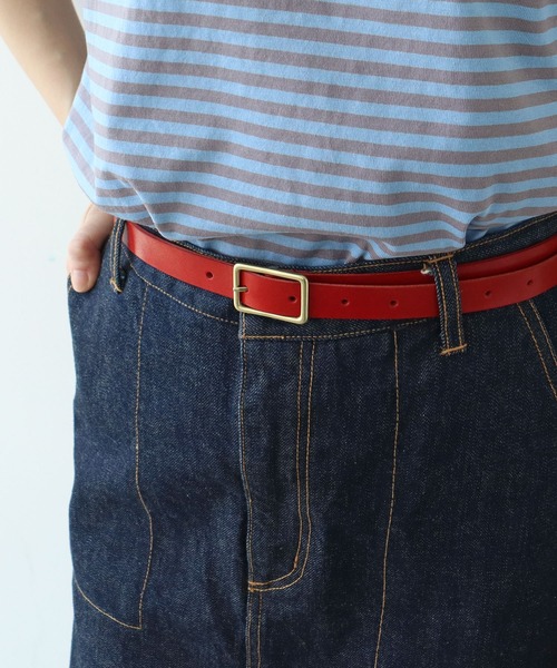 経年変化を楽しめるレザーベルト。 絶妙な太さと華奢なバックルでスタイリングに馴染むデザイン。ブラックはメンズライクなシルバー、ブラウンとレッドはアンティークゴールドのバックルです。光りすぎず程よくアクセントとなり、こなれた雰囲気でつけていただけます。使い始めは硬くハリがありますが、使い込むうちに柔らかく風合いが出ます。ウエストのシルエットに響きにくい、すっきりとした使いやすい厚みも魅力です。 【素材の特性・お取り扱いの注意】 ・取り扱いの注意については取り扱い表示をよくご確認の上、着用をお願い致します。 ・天然皮革を使用している為、一点一点に個体差がございます。表面に見られるシワや色ムラは革本来の風合いですので、天然素材ならではの味わいとしてお楽しみ下さい。 ・ベルト裏側に天然素材特有のざらつきがある場合がございます。あえて裏側に革を重ねないことで、薄く扱いやすいカジュアルな製品に仕上げております。 ・デリケートな素材の為、水や汗で濡れたり摩擦が生じた場合に色落ちし、風合いが変化する場合がございます。淡色の衣類と合わせる際は特にご注意下さい。濡れてしまった場合は速やかに衣類から遠ざけ、柔らかい布で叩くように水気を取って陰干しをして下さい。 ※撮影画像は、光の当たり具合やモニターの環境により色味が違って見える場合がございます。あらかじめご了承下さい。