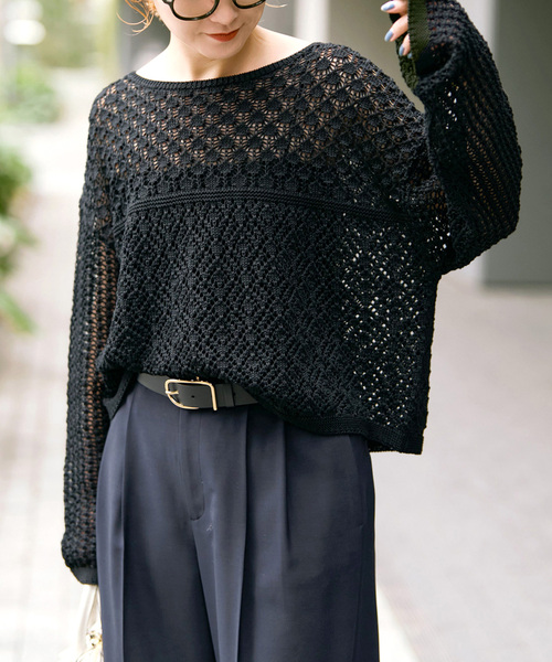 再リク多数!お待たせしました。 軽やかに透ける、大人のボートネックニットがWEB限定で追加決定! さりげない透け感が魅力の、上品ボートネックニット。 コットン素材を使用した、さらっとした肌触りが心地よい一枚。 繊細な透かし編みが軽やかな表情を生み、清涼感のある着こなしを叶えます。 デコルテをきれいに見せるボートネックが、女性らしく抜け感のある印象に。 ほどよくゆとりのあるシルエットで、身体のラインを拾いにくく、自然なリラックス感を演出します。 インナー次第で雰囲気を変えられ、レイヤードも楽しめるデザイン。 一枚着から羽織りのインまで、幅広いスタイリングに活躍するコットンニットです。 ※こちらの商品は 26080200558020 追加商品です。 ※本品番はオンライン限定での展開です。 ※追加生産商品は、一部の店舗や通販で販売されている場合がございます。あらかじめご了承ください。 ※同一商品でも個体差により、採寸サイズに若干の差が生じる場合がございます。 ※レビュー内容には、品番の異なる同商品のレビューが含まれている場合があり、現在展開していないカラーやサイズの内容が含まれることがございます。 ※取り扱いについては、商品についている品質表示でご確認ください。 ※こちらの品番は、Spick & Span オンライン限定での取り扱いになります。店舗でのお取り扱いはございませんのでご注意ください。なお、入荷店舗は予告なく変更になる場合がございます。 ※照明の関係により、実際よりも色味が違って見える場合があります。 またパソコン・スマートフォンなどの環境により、若干製品と画像のカラーが異なる場合もございます。 ※商品の色味は、商品アップ画像をご参照ください。 ブラック着用スタッフ:160cm 着用サイズ:フリー ホワイト着用スタッフ:160cm 着用サイズ:フリー 詳細着用スタッフ:163cm 着用サイズ:フリー 本体:手洗い可能