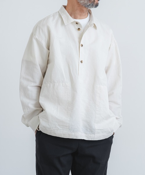 柔らかさと清涼感を兼ね備えた高密度織素材を使用したプルオーバーシャツ。 裾ゴムや、ステッチワークによるパッカリングを効かせたスラッシュポケットなど、随所にワークテイストのディテールを取り入れた遊び心のある一枚です。 直線的なオーバーサイズシルエットを楽しめるデザインで、裾のゴムを絞ることでフォルムに変化をつけられるのも魅力。 スタイリングや気分に合わせてシルエットを調整できます。 さらに吸湿性・速乾性に優れたラミー素材をブレンドしているため、春先はもちろん、湿気の多い梅雨の時期まで快適に着用可能。 長いシーズンで活躍してくれるアイテムです。 【コットンラミー高密度ウェザー】コットンとラミーを高密度に織り上げたウェザー素材。 しなやかさの中に程よいハリとコシがあり、ラミー特有のドライなタッチと清涼感が特徴です。 着込むほどに風合いが馴染み、自然な表情の変化を楽しめます。