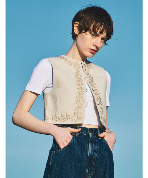 <デザイン> - 洗練された佇まいのベスト - スリムフィット - ボタンフロント - 花と蔓の繊細な刺繍 - 手作業で施されたビーズ <素材> - 上質なリネン素材 - 優れた吸湿性と通気性 - 裏地にはシルクを採用 / 快適な肌触り - 適度なハリ感 ※着用、お取り扱いの際は商品についておりますアテンションタグ、洗濯ネームを必ずご確認ください。 ※モデル撮影画像は、光の当たり具合やパソコンなどの閲覧環境によって、実際の色味と異なって見える場合がございます。商品の色味は商品単体で撮影した詳細画像をご参照ください。 品番:E1JBSSVE22002BGE INTO THE EAST | イントゥ ザ イースト 古美術品の収集用語である“去火気”というコンセプトを掲げた、2023年にスタートした中国発のブランド。素材の経年変化や使い込まれたことで生まれる深みや温かみなどを表現したコレクションを展開しています。