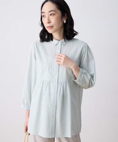 繊細な刺しゅうを重ねたストライプ柄が上品な印象を与えるブラウス。 切り替え下のギャザーがやさしく広がり体のラインを拾いにくく、大人カジュアルに取り入れやすい1枚です。 ワイドパンツでリラックス感を出したり、ロングベストを重ねたレイヤードコーデも楽しめます。