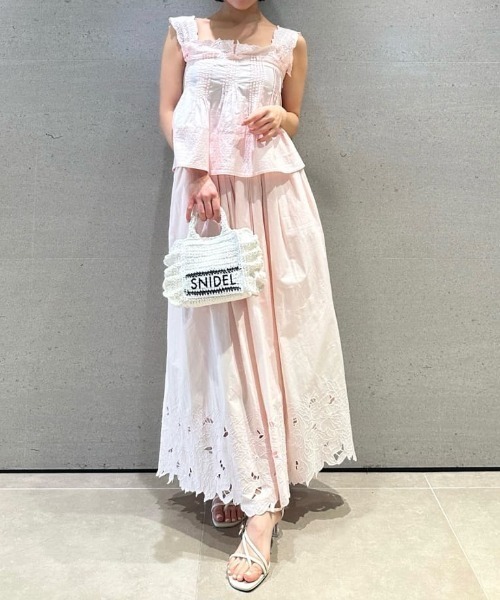 【フローラル刺繍が上品なフレアシルエットのエンブロイダリーコットンスカート】 【Design/Styling】 フローラル模様のインドレース刺繍が華やかなエンブロイダリーロングスカートが届きました。足元に抜け感を加えて軽やかに着こなしていただます。少しハリ感のある素材でふんわりとしたシルエットを作っているので、カジュアルになりすぎずフェミニンな印象に。背中側はゴムでストレスフリーな着心地です。サイドのコンシールファスナーで着脱可能。ポケット付き。裏地付きです。ナイロンパーカー(SWFJ261130)とのセットコーデもおすすめ。ざっくりニット、ジャケット合わせもおすすめです。 【Fabric】 ピュアな印象のホワイト、パウダリーなピンク、マリンな雰囲気のネイビーの3色展開。柔らかなコットン素材を使用。 【おすすめ骨格タイプ】 ■骨格ストレート ■骨格ナチュラル ※照明の関係により、実際よりも色味が違って見える場合があります。 またパソコン・スマートフォンなどの環境により、若干製品と画像のカラーが異なる場合もございます。予めご了承ください。 商品の色味は、商品単品画像をご参照下さい。 ※商品画像はサンプルのため、色味やサイズ等の仕様に変更がある場合がございますので、予めご了承ください。