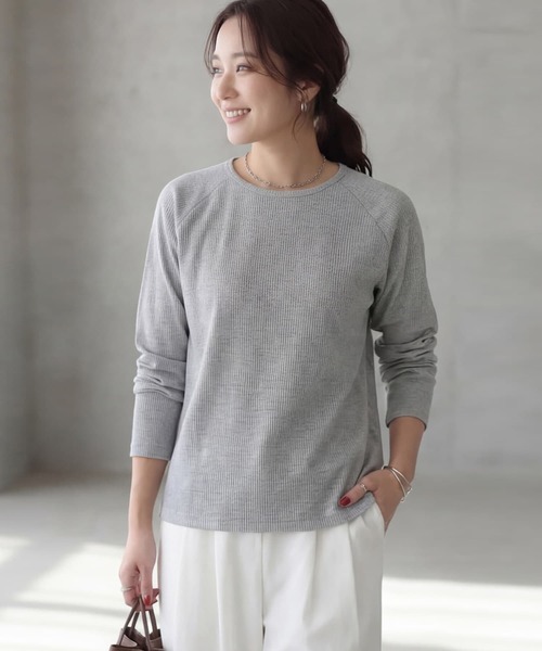 シンプルなTシャツを一枚で格好よく着るのは難しいという大人の悩みに応えるために作られたトップスです。量販品とは異なる細かな工夫により、無理なく洗練された印象に近づける設計で、シンプルコーデでも様になるバランスに仕上げています。 ラグランスリーブでありながら特殊な角度やステッチにより、セットインのような自然な見え方を実現。肩幅を強調せず、鎖骨が見えるすっきりしたネックラインやミニマルな襟ぐりで、カジュアルすぎず女性らしい印象に整えています。体のラインを拾いにくい適度なハリと、程よいゆとりのあるサイズ感も特徴です。 見た目や肌触りはコットンのようでありながら、シワになりにくく上品さのある混紡素材を使用。凹凸のあるリブ生地が肉感をカバーしつつ、動きやすさも確保しています。一枚で着ても安心感があり、ジャケットのインナーとしても使いやすい、汎用性の高い一着です。 【その他の仕様】 ◆着用時期:夏以外 ◆サイズ感:適度なゆとり ◆丈感:ヒップが半分隠れる程度 ◆シルエット:ストレート ◆首元:鎖骨が見えるクルーネック ◆肩幅:問わないタイプ ◆アームホール:広め ◆袖幅:普通のゆとり感 ◆袖丈:長袖 ◆袖口:何も無し ◆袖のたくし上げ:可能 ◆厚み:ややしっかりめ ◆柔らかさ:ハリ感としなやかさが共存 ◆肌触り:サッパリとして滑りが良い ◆着用ジワ:多少はできるが気にならない ◆毛羽立ち:できにくい ◆伸縮性:あり ◆光沢感:なし ◆透け感:なし(ホワイトはややあり) ◆スリット:なし ◆ボタンやファスナー:なし ◆手洗い:可能 ◆アイロン:不要 ◆スチーマー:使用OK 【お色について】 ◆ブラック:定番的な通常のブラックです。 ◆ホワイト:一般的な白いカットソーのお色。イエロー味などの色味感は無いクリアな発色のホワイトです。 ◆ライトグレー:濃淡のグレーと白糸が混ざった杢グレー。カットソーでは定番的なお色の明るいグレーです。