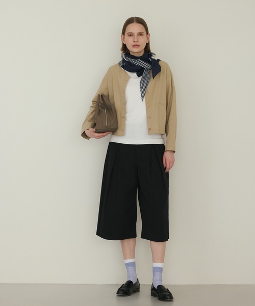 スカート見えする、軽やかなキュロットパンツ フロントに施したボックスタックが印象的なキュロットパンツ。 広がりすぎないシルエットで、スカートのような上品さとパンツの動きやすさを兼ね備えています。ウエストはすっきりとしたデザインで、トップスインもきれいに決まる仕様。 軽やかな丈感が春らしく、足元のおしゃれも楽しめます。オンオフ問わず取り入れやすい、着回し力の高いアイテムです。 コーディネート【ジャケット】 セットアップ風に着こなして、統一感のあるスタイルに。小物はシンプルにまとめるのがおすすめです。 【ブラウス】 やわらかなブラウスを合わせて、女性らしいきれいめコーデに。 【ボーダーカットソー】 フレンチシックなカジュアルスタイルに。足元はバレエシューズで軽快に。 ※照明の関係により、屋外で撮影した写真の商品は、実際よりも色味が違って見える場合があります。またパソコン・スマートフォンなどの環境により、若干製品と画像のカラーが異なる場合もございます。予めご了承ください。実際の商品の色味は、スタジオ撮影の画像をご参照下さい。 ※商品画像はサンプルのため、色味やサイズ等の仕様に変更がある場合がございますので、予めご了承ください。 アイテム詳細 素材:綿58%,再生繊維(セルロース)42% サイズ:【F】ウエスト72cm,ヒップ102cm,股上32cm,わたり39.3cm,股下42cm,裾巾34.5cm ==================== 裏地:なし 透け感:なし 生地の伸び:なし 光沢感:なし ==================== 生産国:中国 品番:12613006 ※取り扱い・ケア方法については、商品についている品質表示でご確認ください。
