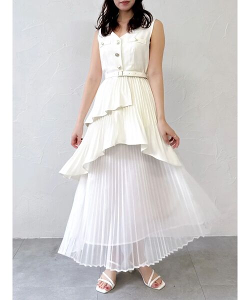 【商品】 上半身はジレ風のクラシカルなデザインで、 金ボタンが上品さをプラス。 下半身は消しプリーツとアシンメトリーティアードが軽やかに広がり、 女性らしさを演出してくれます。 裾にはシアー素材を重ね、歩くたびにふんわりと揺れるのが魅力。 洗練された雰囲気の中に、遊び心も感じられる一枚です。 【スタイリング】 一枚でさらっと着るだけで抜け感のある大人スタイルが完成。 肌寒い時期には、インナーに薄手のニットや シアーアイテムをレイヤードしても◎ 足元はパンプスを合わせると、 よりエレガントな印象に仕上がります。