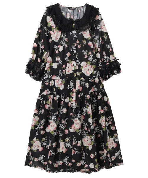 ~Point de Rose~ 優美なレースに包まれた薔薇が人知れず咲いている。 静かな午後、アンティークのレースを縫い留めるように、やさしさと記憶を編み込むように薔薇のレース細工。 インスピレーションの源は、19世紀にベルギーで誕生した「ポワン・ド・ガーズ」 たくさんの職人と技術が駆使された霞のように繊細なレースは、ニードルポイントレースの最高峰とも言われています。 薔薇のモチーフから生命を宿すのは優美な草花のさらし糸のレース「ポワン・ド・ローズ」をモチーフにした華麗で優美なテキスタイルの登場です。 「ポワン・ド・ローズプリント」のミディ丈のティアードワンピース。 襟と袖ぐちまわりに、柔らかなソフトチュールであしらっておめかし。 春風のような優しいフリル使いが可憐な装いに。 前開きタイプなので、ワンピースやペチコートなどを重ねてレイヤードスタイルも楽しめそうです。 柔らかなレースに包まれる、アイボリー ロマンティックに満ちる、ペールピンク 陶磁器をも思わせる、アクアマリン そして、夜に咲く薔薇のすがた、クロ どのカラーの「ポワン・ド・ローズプリント」がお好みですか? *ポワン・ド・ローズプリント* 60ローンにオートスクリーン捺染加工を施したしたテキスタイルは、色ごとに版を作って重ね合わせていく手法を用いているので色の重なりがより美しくなり、繊細な色合いをお楽しみいただけます。 60番手の細くてしなやかな糸を使用した薄手のコットンは、軽い着心地で汗ばむシーズンでもさらりと着やすく通年通してお楽しみいただけます。