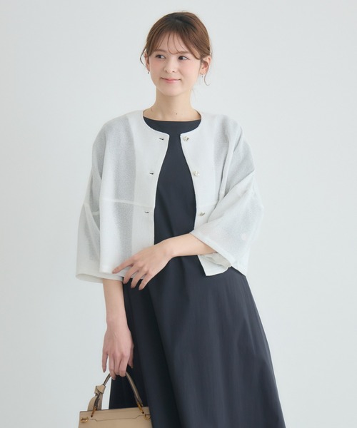 【KATHARINE ROSSオリジナル】ハレの日も、日常の羽織りも。煌めきが主役のサマージャケット [素材] ・カーディガンを羽織るようなリラックスした着心地です。 ・肌離れの良いさらりとした質感で、湿度や気温の高い日でもベタつきにくく、清涼感をキープ。 [デザイン] ・繊細なラメ糸を織り込んだ、贅沢な光沢感が目を引く一着。 ・夏の暑い日の「ハレの日」や学校行事など、フォーマルなシーンでも涼しさをキープ。 ・ゆったりとした身幅に、トレンドのショート丈を組み合わせた絶妙なバランス。 ・ふんわりと丸みを帯びたコクーンシルエットの半端丈袖が、気になる二の腕をカバーしつつ、手首を細く見せてくれます。 ・変形メタルボタンのアクセントが、モダンで知的な印象に。 [スタイリング] ・ハレの日のワンピースから日常のワイドパンツまで、羽織るだけで『透け感×ラメ』の華やぎを添え、理想のスタイルアップを叶える万能な一着です。 ・冷房対策や日差し対策にも重宝するアイテムです。 ■光沢感:あり ■透け感:あり ■伸縮性:あり ■生地の厚さ:薄手 ※照明や光の当たり具合で色味が違って見える場合があります。 ※システムの都合上、店舗より入荷が遅れる場合がございます。 【お買い物をよりお楽しみいただくために】 ・商品のお気に入り登録をおすすめします! ♡マーククリックで登録できます。 完売カラーの再入荷や、ラスト1点になったときの通知、 セールの際に通知などお得な情報を受けることができます。 ・ブランドのお気に入り登録もご一緒にお願いいたします! 新商品や再入荷、などいち早くブランドの最新情報をお届けします。