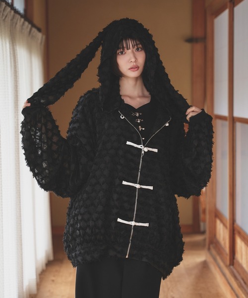 -狐独(コドク)- フードに大きなうさ耳が付いたシアージップアップパーカー ---デザイン--- 起毛感のあるフリンジとうさ耳で よりかわいらしい雰囲気を演出。 透け感のあるシアー生地で 春夏で着れる最強ブルゾンに。 フリンジデザインがあることで 透けすぎない上品なルックスに。 うさ耳付きフードでかわいさを出しつつ チャイナボタンでサブカルアクセントに。 ルーズに着こなせるオーバーサイズシルエットに ジップ仕様でラフさも自在にコントロール。 左腕にはユーティリティポケットを採用。 狐独のブランドタグを付け、象徴的なディテールに。 タグは取り外しができ、付け替えも可能。 袖口には別布のリブが付いており ボリュームスリーブを形成し ブランドらしいサイジングに。 Tシャツ/ロンTやシャツ合わせでモードやサブカルスタイルがおすすめ。 ボトムはハカマやハーフパンツなど春夏まで着回しができます。 ユニセックスサイズ展開--- ~170cm Mサイズ 170cm~ Lサイズ ------------------------------------------------------------------ kodoku._officialインスタグラムでも商品情報をご覧いただけます。 インスタライブで新作アイテムをご紹介。#→狐独/孤独/コドク/kodoku ------------------------------------------------------------------- 【狐独】 性別という意識の先にある、奔放かつ中性的なファッションを提案 ------------------------------------------------------------------------- ※洗濯、お取り扱いの際は、商品に付いているタグから【洗濯表示】【品質表示】と 【アテンションタグ】を必ずご確認ください。 ▼商品のお気に入り登録 完売カラーの再入荷通知や、ラスト1点、セールの通知をお知らせ致します。 ▼ブランドお気に入り登録 新商品や再入荷など、いち早くブランドの情報を受け取ることができます。 ※サイトに表示されているカラー名と実際のお届け商品に記載されているカラー名が異なる場合がございます。