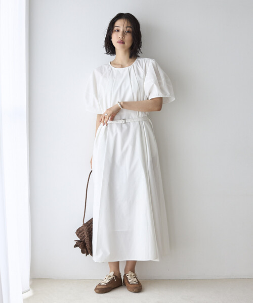 2026 Spring & Summer item 一枚でサマになる立体シルエット。 着るだけで完成するワンピース。 ●綿見えのナチュラルな風合いと、しわになりにくさを兼ね備えたTC素材を使用 ●程よいハリ感のある生地で、立体的なバルーンスリーブと美しいシルエットをキープ ●たっぷりとタックを入れたテントラインで、体のラインを拾わず一枚でサマになるデザイン ●ウエストの共紐ベルトは取り外し可能で、シルエットの変化を楽しめる2WAY仕様 ●ベルトでウエストマークすればメリハリのあるスタイルに、外せばリラックス感のある着こなしに ●後ろにさりげなくあしらったロゴ金属プレートが、上品なアクセントに ●軽やかで清涼感のある素材感で、春夏シーズンも快適に着用可能 ●ヒールやきれいめバッグと合わせれば、ちょっとしたオケージョンシーンにも対応 ●オフカラーのみペチワンピ付きで、透け感を気にせず安心して着用可能 おすすめコーディネート 一枚でさらっと着るだけでスタイリングが完成する主役ワンピース。フラットサンダルやスニーカーと合わせたカジュアルスタイルはもちろん、ヒールやレザーバッグと合わせればきれいめな印象に仕上がります。ウエストベルトでシルエットに変化をつけたり、アクセサリーをプラスすることで、シーンに合わせた着こなしが楽しめます。 ※掲載画像の商品の色味は、屋外や屋内の光の照射や角度により実物と色味が異なる場合がございます。 また表示のサイズ感と実物は若干異なる場合もございますので、予めご了承ください。 ※着用、お取り扱いの際は、商品についている品質表示とアテンションタグを必ずご確認下さい。 【Firsthand / ファーストハンド】 Fashion , Sustainable , Art をテーマに、デザイン性やクォリティー、モノ作りなど、クリエイティブを重視したサステナブルなコンセプトストア。 ここでしか出会えないブランドやアイテム、ここでしかできない実体験、新しくスタイリッシュなカルチャーとファッションをここから発信していきます。フリークスストア等を構えるデイトナインターナショナルが発信するブランドです。 Instagam : @firsthand__official