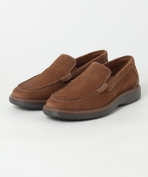 シンプルなデザインと、革本来の風合いを楽しめる「CRAVEN(クレイヴン)」。 甲部分に施された細やかなパーフォレーション(穴飾り)が、涼しげな表情と通気性を生み出し、春夏シーズンの足元を軽やかに彩ります。 アッパーには柔らかなカウレザーを使用し、部分的にあえてライニング(裏地)を省いた一枚革仕立てにすることで、足全体をくったりと包み込むような「素足感覚」のフィット感を実現。革の柔らかさをダイレクトに感じていただける、贅沢な仕様です。 インソールにはアッパーと同色のレザーを採用し、脱いだ時にも統一感のあるシックな印象を与えます。 履き口の両サイドには目立ちにくいゴム(ヒドゥンゴア)を配置しているため、甲へのフィット感が高く、手を使わずにサッと脱ぎ履きできるスマートさも魅力。 ソールには軽量でクッション性に優れたEVAと、グリップ力の高いラバーを適所に配置。約3cmの厚みのあるソールが地面からの衝撃を和らげ、かかと部分の「truTECH(トゥルーテック)」機能と相まって、長時間歩いても疲れにくい快適な履き心地を実現しました。 カラーは、上品なコニャック、落ち着いたダークストーン、爽やかなニュードレスブルースの3色展開。デニムやチノパンはもちろん、ショートパンツと合わせたリゾートスタイルにも映える一足です。 ブランドカラー名:コニャック/靴幅:W ※素材に適したクリーム・クリーナー等のお手入れ製品をご使用ください。 <ROCKPORT TECHNOLOGY(ロックポートテクノロジー)> ■truTECH(トゥルーテック) 歩くときにかかる踵への衝撃を吸収、グラつきを抑えて歩行時の安定感を高めます。 ------------------------------ ■ROCKPORT(ロックポート) ロックポートは、1971年にアメリカ・ボストンで生まれたレザーシューズブランドです。 「クッション性」「衝撃吸収力」「屈曲性」などを追求した独自のテクノロジーを搭載し、アクティブなライフスタイルを送る人々へ『妥協しない快適な履き心地とスタイルを提供する』 をコンセプトに幅広いシューズを展開しています。