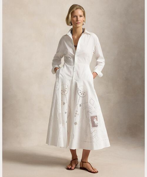 繊細なアイレット刺繍でスカートにディテールを添えたコットンシャツドレス。パネル構造のデザインを取り入れて、ロマンティックなAラインのシルエットを演出。 ・Aラインのシルエット / ミッドカーフ丈。 ・ポインテッドカラー / ボタン付き前立て / シェルボタン。 ・長袖、ボタン付きバレルカフス / ウエストにサイドシームポケット。 ・ウエストにヨーク / ウエストの前後にダーツ / バックヨーク / 裏地なし。 ・モデル身長178cm、着用サイズ4。 ※商品の色味は、光のあたり具合など諸条件により色感が多少異なって見える場合がございますので予めご了承下さい。 ポロ ラルフ ローレン