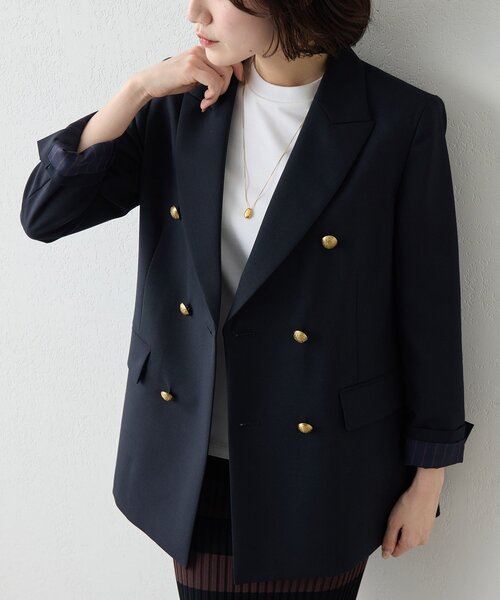 【2026SS】 構築的シルエットがクラシカルモダンな定番紺ブレ ■クラシックな中にもモードなエッセンスを感じさせる、存在感あるジャケット。 ■平織りながら厚みと奥行きを感じるドライタッチな生地を使用。 ■シャープな印象の金ボタンがアクセントになり、ストライプ柄の裏地は袖を折り返しても◎。 ■肩周りに程よくゆとりを持たせたボクシーなラインに、品のあるダブルブレストが羽織るだけで決まる一着。 ■カジュアルからきれいめまで様々なスタイルに馴染み、オンオフ問わずに活躍出来るアイテム。 【COLOR】 ネイビー:きちんと感を演出してくれるシックなダークネイビー 。 【MATERIAL】 適度なドライタッチをもち、平織りでありながらオックスのような見え方で迫力のある表情感が特徴の生地。 ---------------------------------------------------- 洗濯方法:ドライクリーニング 透け感:なし 裏地:あり 伸縮性:なし 光沢感:なし ---------------------------------------------------- 【注意事項】 ・画像の商品はサンプルです。実際の商品と仕様、加工が若干異なる場合があります。 また 、パソコンやスマートフォンのモニター環境などにより、色味が違って見える場合があります。 ・店頭及び屋外での撮影画像は、光の当たり具合で色味が違って見える場合があります。 商品の色味は、スタジオ撮影の画像をご参照ください。 ・入荷状況により、お届け予定が前後する場合があります。 ・お客様への発送が店頭販売より遅れる場合があります。 ・追加生産商品は、一部の店舗、通販で販売中の場合があります。 予めご了承下さい。 【気になるアイテムは、「お気に入り」登録を】 ハートマークをクリックしておくことで、スムーズにお買い物が楽しめます。 ・ラスト一点のお知らせ ・再入荷のお知らせ ・SALEのご案内