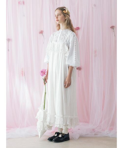 10周年を記念したアニバーサリーアイテム『WHITE COLLECTION』。 レースが並んだような凹凸感がかわいいドビー生地を使用しました。 大きめスカラップがポイントのオリジナル花柄レースを胸元と裾に入れて、身頃はすっきりと仕上げました。 アンティークのワンピースのような雰囲気です。 ※商品画像は、撮影環境やお客様のご利用のPC・スマートフォンのモニター環境などにより実物と色味に差異がある場合がございます。 【その他採寸】 F 身幅:[ゴム仕様]96cm 全長:[肩ひも]40cm