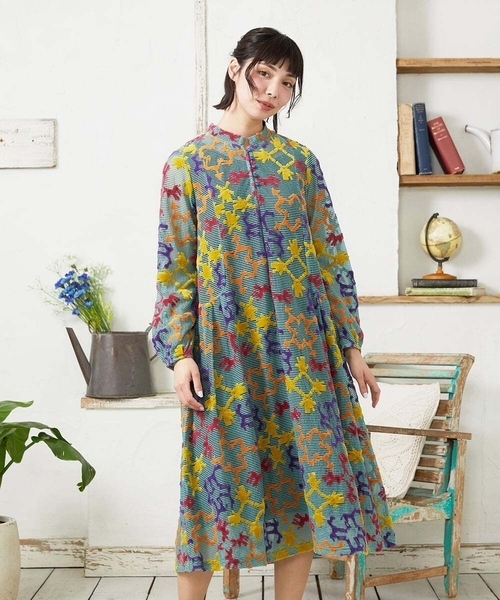 Caballerias(カバイェリアス)= 騎士道物語 26年SSテーマ スペインの小説「才気あふれる郷士 ドン・キホーテ・デ・ラ・マンチャ」にちなんで、柄には登場人物や衣装など物語の名前がつけられていています。 ■デザイン 風車とアニマルモチーフを組み合わせた柄のワンピース。テーマの「騎士道物語」からインスピレーションを受けています。柔らかい素材も相まってふんわりとしたAラインシルエット。首元はほどよいスタンドカラーデザインで上品な印象を叶えます。胸元までのボタンで着脱できる仕様に。サイドのカーブ切り替えやタックで動くたびに揺れ、女性らしい雰囲気を後押しします。物語に登場する動物と風車をモチーフにした主役級ワンピースは今季イチオシのオススメアイテムです。 ■素材 コットンとナイロンで編んだシアーボーダーと表面のモチーフはベロア素材で表現した特別感のあるジャカード素材。ボーダー部分は透け感のある軽やかな生地です。 ■スタイリングポイント インパクトのあるホコモモラならではのワンピース。柄と同色系のアイテムと合わせるとまとまりのあるコーディネートが楽しめます。ジャケットやライトアウターを重ねて気温感を調節することでロングシーズンお召しいただけます。 ---------------- 着用シーズン 春:◎ 夏:× 秋:◎ 冬:△ ---------------- 透け感:アンダードレス着用部分のみなし 生地の厚さ:薄手 光沢感:なし 伸縮性:あり 裏地:アンダードレス付き 洗濯:手洗い ポケット:なし ---------------- 同素材のカットソー【GJKFD01220】もございます。 同テーマの襟付きカットソー【GJKFD02200】パーカー【GJTFD02220】刺繍ブラウス【GJBFD01200】ワンピース【GJEFD01280】もオススメです。 model:H160 B75 W54 H80 着用サイズ:M