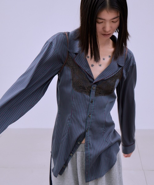 パイピングを効かせたストライプ柄のパジャマ風シャツと、優雅なレース切替を施した同素材のキャミソールのアンサンブル。 セットアップでの着用はもちろん、それぞれが単体で強い個性を放つ、自由度の高いマルチウェイアイテムです。 シャツのインナーにレースを忍ばせる正統派な着こなしから、シャツの上にキャミソールを重ね、ウエストラインを緩やかにシェイプしながら身体のラインを美しく見せるモダンなシルエットまで、多様な表情を楽しめます。 ▼デザイン ショート丈のシャツに、胸元がレース素材になったキャミソールのセットアイテム。 キャミソールの肩紐はアジャスターにより調節可能です。 シャツ、キャミソール共にボタンにて、開閉可能です。 MATERIAL こちらのアイテムは、無地と柄物の異なる3つのファブリックで展開しております。 ※素材ごとに商品ページが異なります。 ▶Chambray(無地) シルクのような柔らかな光沢と、しなやかな落ち感が特徴のシャンブレー素材. なめらかな質感が肌に心地よく馴染み、日常の装いに上品なリラックス感を添えてくれます。 対象品番 : 0586TM0597P ▶Check(チェック) カジュアルさを抑えた艶のある配色のチェック生地。上品で落ち着いた雰囲気の表情に仕上げることで、シックで大人な印象へと導きます。 対象品番 : 0586TM1555P 0586TM0555P THINGS THAT MATTER (シングス ザット マター) まったく新しいアプローチで、コレクションを展開、感じることの大切さを伝えるブランド。 クリエイティブディレクターにはデザイナー武笠綾子を起用。自分の内側に目を向け、自分を愛するきっかけになってほしい。 自分を愛することで一人ひとりの魂が満たされ、エネルギーが整い、正しく循環することでこの星のすべてを愛することに繋がる。 【 気になるアイテムはお気に入り登録をお勧めします!】 ♡マークをクリックし、再入荷やラスト1点の通知、セールなどのお知らせを受けることができ、お買い物が楽しめます。 ブランドのお気に入り登録もぜひお願いします!