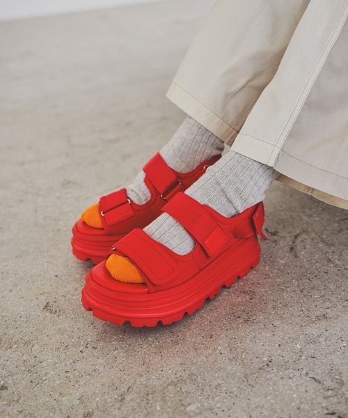 コーディネートを引き立てる大人の厚底サンダル 【デザイン】 ボリュームのあるプラットフォームに太めのベルトを乗せた厚底サンダル。 シンプルなワントーンの中に柔らか素材と丈夫なグログランテープをミックスし、単調にならず奥行きのある足元を演出します。 どんなスタイルにも合う万能なブラック(19)、差し色にも主役にもなる鮮やかなレッド(30)、クリーンで肌馴染みが良いアイボリー(52)の全3色展開。 【機能】 クッション性のある厚めの低反発スポンジ入りで、足当たりが良い履き心地です。 サイズ調節が可能なベルクロ仕様のため、かかとまでしっかりホールドしてくれます。 ソールの前と後ろの高低差がフラットに近い感覚で歩きやすく、自然なスタイルアップ効果も期待! カジュアルからモードまで、幅広い着こなしにマッチします。 ロング丈のワイドパンツやスカートから覗くだけでも、今っぽいシルエットが完成! 夏は素足で軽やかに、春や秋はソックスを合わせて、違った表情を楽しむのもおすすめです。 ※サンプルにて撮影をしておりますので、実際の商品とは仕様や加工・サイズ等が若干異なる場合がございます。 ※屋外の光や照明の当たり具合で、実物と色味が異なって見える場合がございます。詳細画像の色味をご確認ください。 なお、商品の色や質感を出来るだけ忠実に再現するよう心掛けておりますが、パソコンなどの環境により、実物と若干異なる場合がございます。 ※写真を許可無くコピー・転用することは固くお断りします。