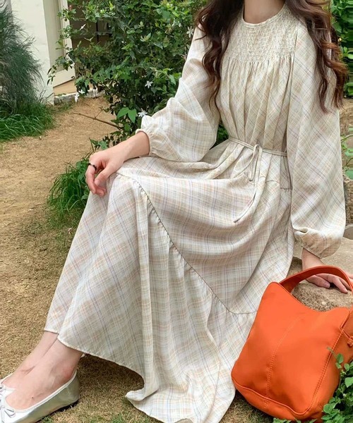 派手すぎないひかえめなチェック柄と優しい配色がレトロかわいいロングワンピース 広がり過ぎない上品なティアードデザイン。 ロング丈で歩く度にふわっと広がるフレアシルエットがナチュラルでガーリーな仕上がりの一枚。 程よいボリューム感のあるスリーブに、ネックと袖口はシャーリングで華奢見え。 身体を締め付けないゆったりとしたラインで、リラックス感がある着心地。 バッグやアクセでガーリースタイルに、ジャケットを合わせて大人かわいいスタイルにも◎ 自然体で楽しめる着映えワンピースは、普段のお出かけはもちろん、デートやカフェ巡り、休日のリラックスコーデにもぴったり。 リゾートや旅行にもおすすめの軽やかな素材感で、春から秋まで長く活躍します。 淡いトーンでまとめたカラーリングで、どなたでも挑戦しやすく、ナチュラル系・韓国ガーリー系が好きな方にもおすすめの一枚です。