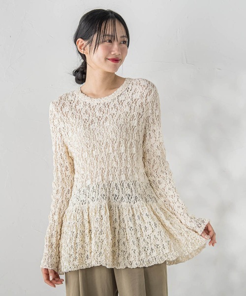 繊細で立体感のあるフラワーモチーフのストレッチレースが存在感のあるプルオーバー。 エレガントな雰囲気とは相反してしっかりとしたストレッチ性があり、着心地抜群です。 ブラウスライクなペプラムデザインにギャザーを入れ、より立体感が感じられる華やかな1枚に仕上げました。 中にキャミソールや薄手のタートルネックを合わせるのはもちろん、ニットやスウェットを上に着て裾だけ見せるレイヤードスタイルもおすすめです。 着丈64㎝でお尻が隠れる絶妙な丈感にしています。 ---------------------------------------------------------------- 洗濯方法 家庭洗濯:液温は40℃を限度とし、手洗いができる。 自然乾燥:日蔭の吊り干しがよい。 アイロン:底面温度120℃を限度としてアイロン仕上げができる。 ドライクリーニング:石油系溶剤による弱いドライクリーニングができる。 ---------------------------------------------------------------- ※画像の商品はサンプルとなりますので実際の商品と仕様、加工、サイズが若干異なる場合がございます。 ※お客様のモニター環境により実際のお色と多少異なる場合がございます。 ※撮影状況や光の当たり具合により、色合いが異なって見える場合がございます。 ※商品タグに記載されたサイズはヌードサイズです。実際の商品のサイズは商品情報の実寸をご確認ください。 --------------------------------------------------------------------▼商品のお気に入り登録 ハートマークをクリックし、お好きなカラーを選んでお気に入りに登録 完売カラーの再入荷通知や、ラスト1点の通知、セールの通知も受け取ることができます。 ▼ブランドのお気に入り登録 新商品や再入荷等、いち早くブランドのお得な情報を受け取ることができます。 --------------------------------------------------------------------