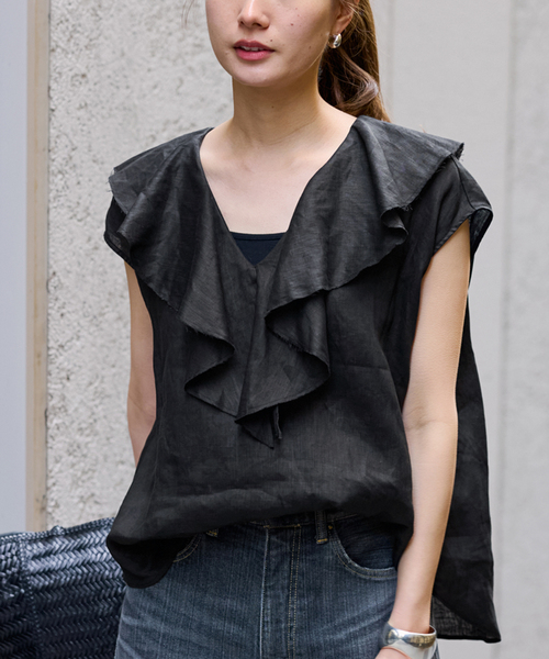 ◆大ヒット!フレンチリネンフリルプルオーバーが再入荷! ・旧品番25051220602020の追加品番です。 ・同一商品でも個体差が生じるため、採寸内容に若干の差が生じる場合がございます。 定番のフレンチリネンを贅沢に使用したフリルプルオーバー。 深めのVネックにラッフルフリルをあしらい、大人の甘さを演出します。 袖はフレンチスリーブにすることで、すっきりとした印象とシックな雰囲気をプラス。 切りっぱなしのフリルに加えて製品洗いを施しラフに仕上げました。 ********************** 透け感:ホワイトのみややあり 裏地:なし 伸縮性:なし 光沢感:なし 生地の厚さ:普通 ********************** ※取り扱いについては、商品についている品質表示でご確認ください。 ※こちらの商品は、FRAMeWORK での取り扱いになります。 直接店舗へお問い合わせの際は FRAMeWORK 店舗へお願い致します。 ※照明の関係により、実際よりも色味が違って見える場合があります。 またパソコン・スマートフォンなどの環境により、若干製品と画像のカラーが異なる場合もございます。 予めご了承の上ご注文ください。 ※商品の色味は、商品アップ画像をご参照ください。 本体:手洗い可能