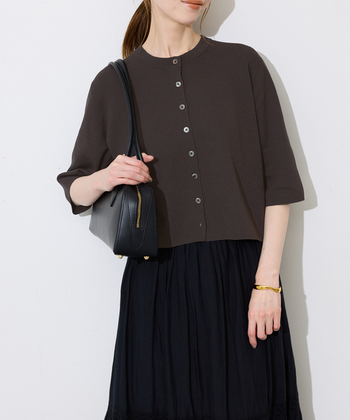 手洗い可能/ボタン開き/5分袖 【2026SS】 SLOBE IENA POINT 夏に嬉しい遮熱機能・UVカット機能付きで 着る日傘のようなカーディガン 【素材の特徴】 ポリエステル混のニットで しわや型崩れしにくくお取り扱いのしやすさも◎。 温度調整がしやすいので 夏場の冷房対策もばっちりです。 【デザイン】 上品でクラシックな印象なので オフィスシーンにも活躍します。 肘までしっかり隠れて二の腕カバーでき、 春~初夏、初秋まで使いやすい1着。 袖が邪魔になりにくいので PC作業・家事などで手元がもたつかないところも◎。 【コーディネート】 小さめボタンがさりげないアクセントに。 イージーパンツやレーススカートなど普段着から スラックスでお仕事シーンにも着用できます。 ********************** 透け感:ややあり(ナチュラル、グリーンのみ) 裏地:なし 伸縮性:ややあり 光沢感:なし 生地の厚さ:普通 ********************** 《スタッフ名:Sally》 年齢:30代後半/身長:162cm/体型:細身/普段サイズ:M/着用サイズ:フリー サイズ感:ウエストくらいの着丈ですっきり着こなせます。袖丈が長いので安心感があります。 素材感: さらっとしていて肌当たりが良いです。 着心地:身体にくっつかず、冷房対策や日差し除けにも使えそうです。 ********************** ※取り扱いについては、商品についている品質表示でご確認ください。 こちらの商品は、SLOBE IENAでの取り扱いになります。 直接店舗へお問い合わせの際はSLOBE IENA店舗へお願い致します。 ※照明の関係により、実際よりも色味が違って見える場合があります。 またパソコン・スマートフォンなどの環境により、若干製品と画像のカラーが異なる場合もございます。 予めご了承ください。 ※商品の色味は、商品アップ画像をご参照ください。 本体:手洗い可能