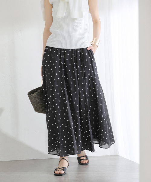 【2026SS】 La Totalite 繊細なドット柄が目を惹く、軽やかな麻ボイル素材のスカート。 ふんわりとした分量感がありながらも、落ち感のある生地で広がりすぎず、すっきりとしたシルエットに仕上げました。 通気性の良い麻混素材は、暑い季節にも快適な穿き心地が魅力。 ご自宅で洗えるイージーケア仕様なのも嬉しいポイントです。 ********************** 透け感:なし 裏地:あり 伸縮性:なし 光沢感:なし 生地の厚さ:普通 ********************** 【スタッフ着用コメント】 《スタッフ名:mizuki》 身長:160cm/体型:普通/普段サイズ:S~M/着用サイズ:38 サイズ感:ウエストは総ゴムで窮屈過ぎずジャストサイズ。着丈は足首が隠れるほどあります。 素材感:清涼感のある麻混素材。ドライタッチな肌触り。 着心地:ウエストゴムでストレスフリーな履き心地です。 ********************** ※取り扱いについては、商品についている品質表示でご確認ください。 ※照明の関係により、実際よりも色味が違って見える場合があります。 またパソコン・スマートフォンなどの環境により、若干製品と画像のカラーが異なる場合もございます。 ※商品の色味は、商品アップ画像をご参照ください。 着用モデル身長: 162cm 着用サイズ:38 本体:手洗い可能