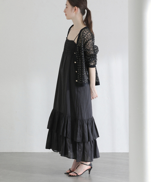 【2026SS】 La Totalite 軽やかな素材感が魅力のキャミティアードワンピース。 胸元のシャーリングデザインが程よいフィット感を生み、女性らしいシルエットを演出します。 歩くたびに揺れるティアードデザインが華やかさをプラス。 1枚で着映えする主役級ワンピースで、サンダルやフラットシューズと合わせたリラックススタイルがおすすめです。 ご自宅で洗えるイージーケアも嬉しいポイント。 ********************** 透け感:なし 裏地:あり 伸縮性:なし 光沢感:なし 生地の厚さ:普通 ********************** 【スタッフ着用コメント】 《スタッフ名:mizuki》 身長:160cm/体型:普通/普段サイズ:S/着用サイズ:38 サイズ感:バストは締め付けはなく程よいフィット感。アジャスター付きで着丈の調節が可能。 素材感:肌あたりが滑らかで柔らかな素材。 着心地:ボディラインを拾わず、リラックス感のある着心地でした。 ********************** ※お取り扱いについて 001(ブラック) 他の製品に色が映ることがありますので、単独で洗ってください。 ※取り扱いについては、商品についている品質表示でご確認ください。 ※照明の関係により、実際よりも色味が違って見える場合があります。 またパソコン・スマートフォンなどの環境により、若干製品と画像のカラーが異なる場合もございます。 ※商品の色味は、商品アップ画像をご参照ください。 着用モデル身長: 164cm 着用サイズ:38 本体:手洗い可能