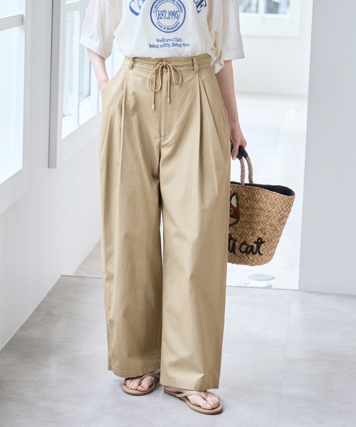 ※店舗は4月3日~先行発売がございます。 予めご了承下さい。 リラックス感と品の良さを兼ね備えたチノパンツ。 イージーに穿けるウエストゴム仕様で、スウェットライクな快適な履き心地を実現。 フロントはジップ仕様に加え、付属の紐をアクセントとして取り入れることで、トップスをインしたスタイルも様になります。 ゴムギャザーだけでなくタックを施すことで、ラフになりすぎずきれいめな印象に。 定番のチノパンツよりもややボリュームを持たせたシルエットが、程よい抜け感を演出します。 表面には微起毛加工を施したやわらかな素材を使用し、優しい肌触りと快適な穿き心地に仕上げた一本です。 ********************** 透け感:なし 裏地:なし 伸縮性:なし 光沢感:なし 生地の厚さ:普通 ********************** ※取り扱いについては、商品についている品質表示でご確認ください ※こちらの商品はU by SPICK&SPAN店舗での取り扱いになります。 直接店舗へお問い合わせの際は、U by SPICK&SPAN店舗までお願い致します。 ※照明の関係により、実際よりも色味が違って見える場合があります。 またパソコン・スマートフォンなどの環境により、若干製品と画像のカラーが異なる場合もございます。 ※商品の色味は、商品アップ画像をご参照ください。 本体:手洗い可能