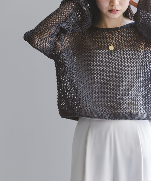 大きめの編地にざっくりと編んだ透け感が可愛いショート丈ニットプルオーバー。 ドライタッチでしっかりとした風合いの糸なので肌離れもよく清涼感たっぷりに着用することができます。 ゆったりとしたボックスシルエットに絶妙なショート丈がシンプルに纏うだけでニュアンシー。 シンプルなショート丈トップスはハイウエストボトムだけでなく、キャミワンピースの上からなどにも合わせることができ、春夏のレイヤードスタイルに重宝します。 しっかりと透け感があるのでインナーにプリントTシャツやボーダータンクなどを合わせてアレンジも楽しめるのも魅力です。 ********************** 透け感:あり 裏地:なし 伸縮性:あり 光沢感:なし 生地の厚さ:普通 ********************** 【スタッフ着用コメント】 年齢20代/身長:155cm/体型:やや細身/普段サイズ:34~36/着用サイズフリー サイズ感:身体から離れるややゆったりとしたサイジング。 身幅が広いのでリラックスして着用できます。 着丈は短く骨盤より上あたりの長さでした。 素材感:ドライタッチでさらりと着られる素材。 着心地: 目の粗いメッシュ素材なので、通気性がよく気温が高い日も涼しく着られそうです。 ********************** ※取り扱いについては、商品についている品質表示でご確認ください。 ※こちらの商品は、NOBLEでの取り扱いになります。 直接店舗へお問い合わせの際はNOBLE店舗へお願い致します。 ※照明の関係により、実際よりも色味が違って見える場合があります。 またパソコン・スマートフォンなどの環境により、若干製品と画像のカラーが異なる場合もございます。 ※商品の色味は、商品アップ画像をご参照ください。 グレー着用スタッフ身長:160cm 着用サイズ:フリー ホワイトA着用スタッフ身長:155cm 着用サイズ:フリー グリーンB・ブルーA着用スタッフ身長:164cm 着用サイズ:フリー モデルサイズ:身長:163cm 着用サイズ:フリー 本体:手洗い可能