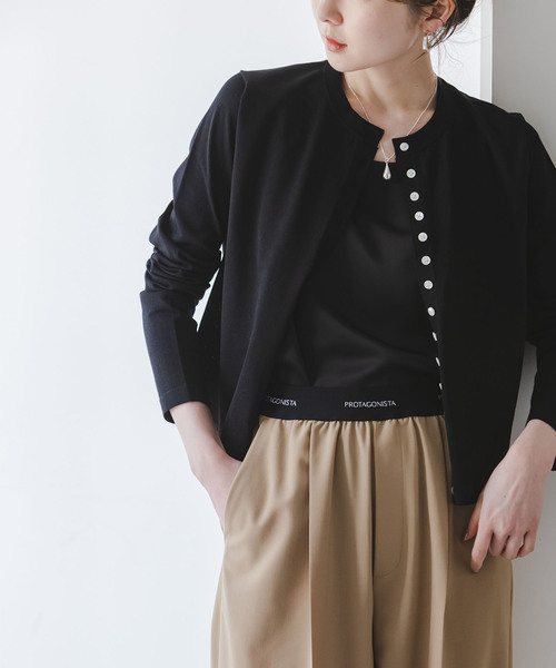 ベーシックで普遍的なデザインがあらゆるスタイルに寄り添うクルーネックカーディガン。 間隔を狭く多めに配置したフロントボタンがさり気ないアクセントになりつつ、プルオーバーとしても羽織りとしても合わせやすい1着。 長く続く暑い季節にも嬉しいドライタッチで透け感があるくらい薄手のコットン×ポリエステル素材で仕立てており、肌あたりもよく快適な着心地なのも魅力です。きれいな表面感の編地なので粗野な印象少なく、キレイめに着用できます。 ベーシックなブラック・ブラウンに、今シーズンのムードのマリンテイストを想わせるブルー・ブラウンボーダーの4色展開。 同素材のタンクトップとのアンサンブルの着こなしもお勧めです。 ●シリーズのご案内 18G CO/PL タンク(商品番号:26080240824020) ********************** 透け感:あり 裏地:なし 伸縮性:ややあり 光沢感:なし 生地の厚さ:薄手 ********************** 【スタッフ着用コメント】 年齢20代/身長:155cm/体型:やや細身/普段サイズ: 34~36 /着用サイズ:フリー サイズ感:ややコンパクトなサイジング。 リブではないのでフィットはしないです。 着丈は短めで、骨盤あたりまでの長さ。 素材感:スムースで柔らかな風合い。 着心地:さらりとしていて軽い着心地。 ドライタッチなので夏の冷房や紫外線対策でも着やすそうです。 ********************** ※ブルーA(045)のみ 色あせ:日光や蛍光灯の光に弱く、色あせ(変色)しやすい性質があるので、長時間の直射日光は避けてください。 ※取り扱いについては、商品についている品質表示でご確認ください。 ※こちらの商品は、NOBLEでの取り扱いになります。 直接店舗へお問い合わせの際はNOBLE店舗へお願い致します。 ※照明の関係により、実際よりも色味が違って見える場合があります。 またパソコン・スマートフォンなどの環境により、若干製品と画像のカラーが異なる場合もございます。 ※商品の色味は、商品アップ画像をご参照ください。 ブラック・ブラウンベース着用スタッフ身長:164cm 着用サイズ:フリー ブラウン着用スタッフ身長:155cm 着用サイズ:フリー ブルーA着用スタッフ身長:160cm 着用サイズ:フリー モデルサイズ:身長:163cm 着用サイズ:フリー 本体:手洗い可能