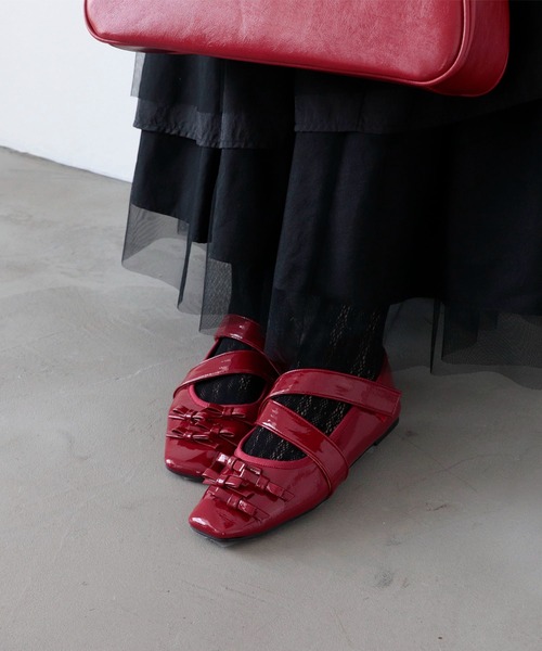 カジュアルな印象で合わせられるラフなバレエシューズ スクエアトゥと斜めストラップ+ベルクロ仕様が甘くなりすぎず、コーディネートの幅を広げてくれます。 ツヤッと光るエナメルとメタリックカラーで足元にトレンド感をプラス。 ソックス合わせやワイドデニムに映えること間違いなし!