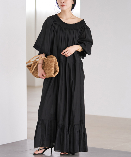 柔らかなコットン素材でふんわり着映える、フェミニンなワンピース。 ギャザーをたっぷり施した、甘さの中に上品さを感じる表情豊かなデザインが魅力。 軽やかな素材感で、動くたびになびく美しいシルエットを演出。 前後2wayで着られて前を開けて羽織りとしても使えるため、レイヤードスタイルにもおすすめ。 デイリーにもリゾートスタイルにもぴったりな、大人のための一着です。 ********************** 透け感:ややあり 裏地:なし 伸縮性:なし 光沢感:なし 生地の厚さ:やや薄手 ********************** ※シリーズのご案内 IND VOIL EMB ブラウス(商品番号:26051922303010) ※取り扱いについては、商品についている品質表示でご確認ください。 ※ 店頭及び屋内外での撮影画像は、光の当たり具合で色味が違って見える場合があります。 商品の色味は、商品アップ画像をご参照ください。 また、お客様のお使いのPCのモニター環境などにより色味が違って見える場合があります。 予めご了承の上ご注文ください。 本体:手洗い可能