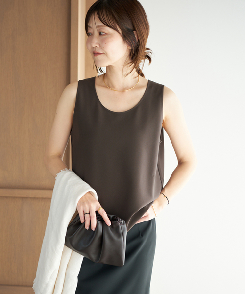 上品な肌見せを叶える、ミニマルなタンクトップ。 張りのあるダンボール素材を使用し、一枚で映えるアイテムに仕上げました。 厚みのある生地を活かし、接着タイプの縫い代にすることでステッチのないミニマルなデザインに。 Iラインシルエットとヒップが隠れる丈感で、抜け感のあるバランスを演出。 透け感のあるボトムとも相性が良く、夏のスタイリングにも取り入れやすい一枚。 Satin Bias Relax パンツと合わせた、ベージュやグレーの洗練されたワントーンコーデもおすすめ。 ********************* 透け感:なし 裏地:なし 伸縮性:ややあり 光沢感:なし 生地の厚さ:普通 ********************** ※取り扱いについては、商品についている品質表示でご確認ください。 ※ 店頭及び屋内外での撮影画像は、光の当たり具合で色味が違って見える場合があります。 商品の色味は、商品アップ画像をご参照ください。 また、お客様のお使いのPCのモニター環境などにより色味が違って見える場合があります。 予めご了承の上ご注文ください。 本体:手洗い可能