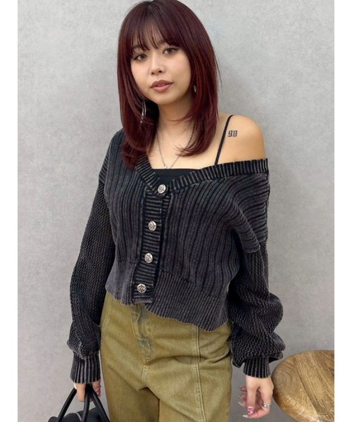 ■デザイン 前後2WAYで着用できるニットカーディガンです。 身頃と袖で編地を変えており立体感のある1枚に仕上がっています。 綿100%の素材を使用しており ピグメント加工をかけヴィンテージ感のあるデザインに。 アンティークシルバーのボタンもポイントです。 ■スタイリング 1枚でも、羽織としてでも着用できるため どんなボトムスとも相性が良いです。 透けがあるのでインナーには ビスチェやキャミソールを合わせて着用するのがおすすめ。 -------------- 透け感:ややあり 裏地:なし 生地の厚み:普通 伸縮性:あり --------------