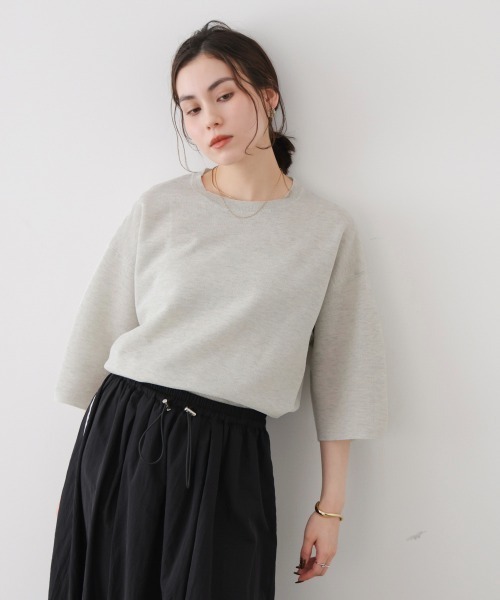 ■POINT さっと着るだけで、いつものコーデが少しだけ華やぐ。そんな大人のためのニットTシャツです。ラメのようにキラキラと光る糸を編み込み、シンプルなのにほんのり上品な輝きをプラス。袖口や身頃にはほどよいゆとりを持たせ、気になる体のラインを拾いすぎず、抜け感のあるシルエットに仕上げました。ニットなのにTシャツ感覚で着られるので、忙しい朝でも迷わず手に取りたくなる一枚。 ■FABRIC 総針編みでしっかりと目が詰まった編地は、ニットなのにほどよいハリがあり、だらっと見えないのが魅力。適度な厚みがあり、季節の変わり目にも活躍します。さらにニットならではの伸縮性で動きやすく、長時間着てもストレスフリー。さらっと着られて、きちんと見える。そんな頼れる素材感です。 ★商品のお気に入り登録 登録すると、完売しても再入荷時に通知を受け取ることができます。 ほかにもお得な特典があるかもしれません♪ ★ブランドのお気に入り登録 新商品や再入荷などの情報を受け取ることができますので、是非ご登録ください♪