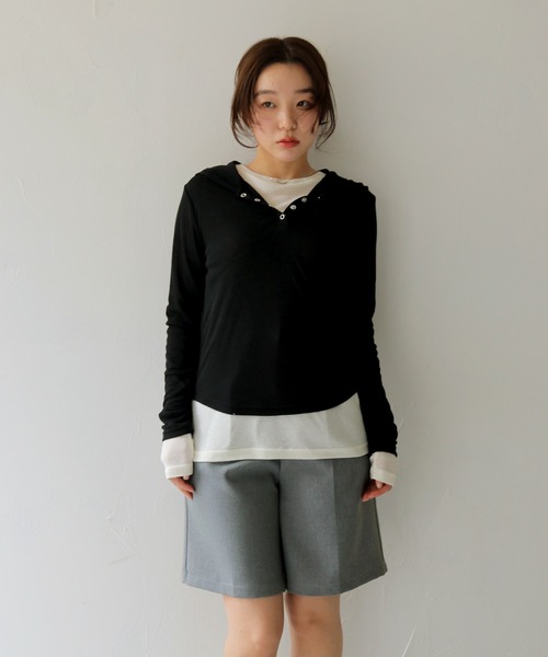 ほどよい透け感とフードデザインが特徴の、シアーフードヘンリーネックトップス。 軽やかなシアー素材でさらっとした着心地に仕上げた一枚です。フロントにはヘンリーネックデザインを取り入れ、ボタンの開け閉めで首元の印象を変えて着こなせるのもポイント。 フード付きのデザインがカジュアルなアクセントになりながら、透け感のある素材がコーディネートに軽さをプラスしてくれます。 シンプルなシルエットで取り入れやすく、一枚で着るのはもちろん、レイヤードスタイルにも活躍。デイリーコーデにさりげない変化を加えてくれるアイテムです。 ≪Styling≫ デニムやカーゴパンツなどと合わせた、ラフなカジュアルスタイルにも自然に馴染む一枚。 キャミソールやタンクトップをインナーに合わせ、シアー素材の透け感を活かした軽やかな着こなしにも。 ヘンリーネックのボタンを少し開けて、抜け感のあるスタイリングに仕上げるのもポイントです。 ジャケットやカーディガンのインナーとしてフードを覗かせたレイヤードスタイルも楽しめ、コーディネートにさりげないアクセントを添えてくれます。 ≪Fabric&Detail≫ 伸縮性・・・あり 透け感・・・あり 厚み・・・★★☆☆☆ ▼《お気に入り登録》のおすすめ▼ 【商品のお気に入り登録】 気になるアイテムのハートマークを押してお気に入り登録すると 完売カラーの再入荷通知やラストの通知、セール通知を受け取ることができます。 【ブランドのお気に入り登録】 新商品や再入荷など、いち早くブランドのお得な情報を受け取ることができます。 ぜひご利用頂き、お買い物をよりお楽しみください。 ※撮影場所により、実際の色味と若干異なる場合がございます。 あらかじめご了承くださいませ。