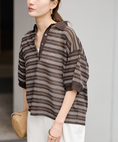 配色で遊ぶ、大人のシアーボーダーニット。 オーガニックコットンとリサイクルポリエステルを使用した、環境にもやさしい混紡素材。 総針で丁寧に編み立てることで、ほんのりシアーながらもふくらみが生まれ立体感のあるフォルムに。 色ごとにボーダーのピッチを変えてバリエーションを出しています。 身幅はゆったり、着丈は短めにデザインし、ボリュームのあるボトムスとも好相性のバランスに整えました。 ********************** 透け感:あり 裏地:なし 伸縮性:あり 光沢感:なし 生地の厚さ:薄手 ********************** ※取り扱いについては、商品についている品質表示でご確認ください。 ※こちらの商品は、FRAMeWORK での取り扱いになります。 直接店舗へお問い合わせの際は FRAMeWORK 店舗へお願い致します。 ※照明の関係により、実際よりも色味が違って見える場合があります。 またパソコン・スマートフォンなどの環境により、若干製品と画像のカラーが異なる場合もございます。 予めご了承の上ご注文ください。 ※商品の色味は、商品アップ画像をご参照ください。 本体:手洗い可能