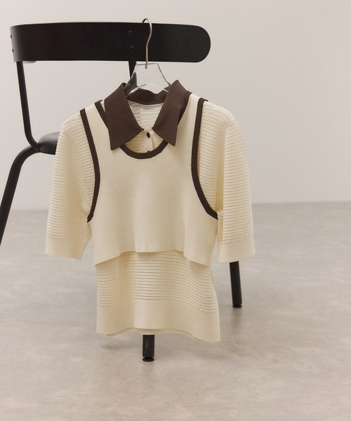 《セットアイテム・イージーケア》軽やかな透け感とレイヤードの配色が心ときめく一着。コンパクトな女性らしいサイジングがスタイルアップを叶えるタンクコンビポロニット ◇26SS◇ ADAM ET ROPE' FEMME 【Material】 さらっとしたリサイクルレーヨン混のストレッチ糸を使用。 ポロシャツ:やや立体感と表情感のある柄を編み立てた生地。 タンクトップ:しっかりとしたリブを編み立てた生地。 【Design】 ポロシャツとタンクトップのセットアイテム。 ポロシャツ:身頃は透け感のある涼しげな柄編みを採用し、袖口や裾はしっかりとしたリブでコントラストをつけたデザイン。コンパクトめなサイズ感やふわっとした絶妙なボリューム感の袖が魅力。 タンクトップ:クロップド丈のコンパクトなタンクトップ。ポロシャツの上にタンクトップを重ねて着用した際の色合わせが魅力。それぞれ単品でも着回しの効くアイテム。 【Color】 オフホワイト×ダークブラウン配色、ブラウンポロシャツ×ブラックタンクトップ、サックス×ダークブラウン配色の3色展開。 ※色により配色の合わせ方が異なりますのでご了承ください。 【Styling Point】 TWシアートロタックパンツやバルーンパンツ合わせがおすすめ。 --------------- 透け感:ポロシャツのみあり 裏地:なし 伸縮性:あり 光沢感:なし 生地の厚さ:薄手 開き方:ボタン開き ポケット:なし --------------- ◇モデル情報 身長:157cm size:F(STAFF) ※撮影時の光、お使いのモニター環境によって色の見え方が違う場合がございます。
