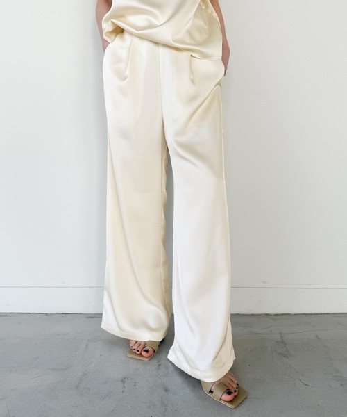 【 SELECTMOCA by son 】 2323son シンプルな色合いの中に、 可愛さをプラスしたコーデやナチュラルなライフスタイルをSNSで発信。 幅広い層の女性から注目を集め、WEAR,instagramを中心に絶大な支持を得ている インフルエンサー【son】と【SELECTMOCA】の コラボシリーズが登場。 -point- & -styling- きちんと感を保ちながら軽やかに着こなせるサテンタックイージーパンツ シューズやトップスを選ばず、 シックにもカジュアルにも自在に着こなせる万能アイテム。 フロントタックが腰まわりに自然なゆとりをつくりながら、 柔らかなドレープが素材の光沢感を引き立てます。 自宅で洗えるケアの手軽さもうれしいポイント◎ 同素材のキャミソール(ve326031)・ ワンピース(op326030)と合わせてセットアップとして着用可能です。 セットアップでの着用はもちろん、 カジュアルなシャツやカットソー合わせもおすすめです。 ウエストゴムとろみパンツ ---------------------------- 素材 ポリエステル100% ---------------------------- 伸縮性 なし 生地の厚さ ★★☆☆☆ 裏地 なし ---------------------------- ※モニター・環境等により実際の商品と多少色味が異なって表示される場合がございます。 予めご了承をお願いいたします。 ======================= ■袋梱包の為、染料による特有の匂いが抜けきれず、匂いがする場合がございますが不良品にはあたりません。 上記注意点での返品、交換はお断りします。ご了承の上お買い求めくださいませ。 ■本製品は生産過程におきまして色味、サイズ感等若干の誤差が出る場合がございます。予めご了承くださいませ。 ======================= 【お買いものをお楽しみいただく為に!】 ▼商品のお気に入り登録 完売カラーの再入荷通知や、ラスト1点の通知、セールの通知も受け取ることができます。 ▼ブランドのお気に入り登録 新商品や再入荷など、いち早くブランドのお得な情報を受け取ることができます!