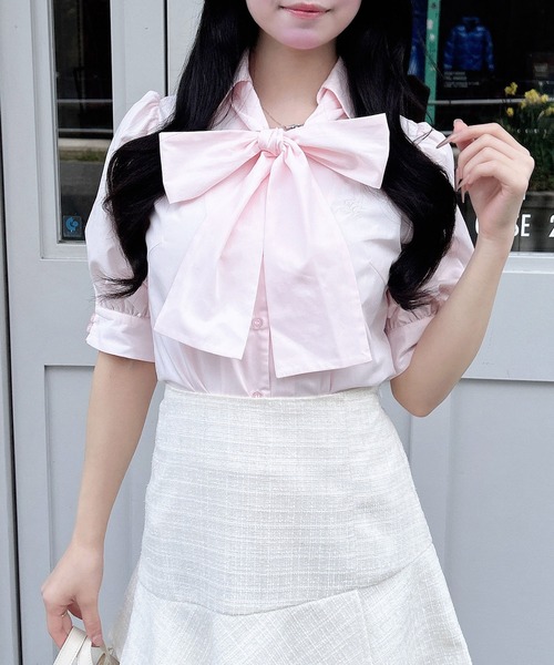 ピンクはWEB限定カラーです★ 【存在感たっぷりのリボンがかわいい♪半袖ボウタイブラウス】 ▼Design 大きめのリボンがフェミニンな雰囲気を演出してくれるアイテム。 ボリューム感のある袖で華奢見えが叶います! 胸元にあしらった刺繍ロゴがアクセントに◎ リボンは取り外しが出来るので、スタイリングや気分に合わせて 様々な着こなしを楽しめます。 ほんのりハリを持たせた生地で普段使いはもちろん、 オフィスシーンにもおすすめ。 ベーシックな無地の他に、清涼感のあるストライプなどもラインナップ。 ▼Styling プリーツスカートと合わせてきれいめガーリーコーデに。 フリルスカートやバルーンスカートを合わせた甘めコーデも◎ 【セット内容】ブラウス、ボウタイ ・ボウタイ取り外し可 【以下ブルー/ストライプ参考。カラーにより多少の誤差あり】 ・透け感:やや透ける ・伸縮性:なし ・生地の厚さ:普通 ・裏地:なし ▼Recommend ・ボウタイ ・リボン ・パフスリーブ ・ブラウス ・ガーリー
