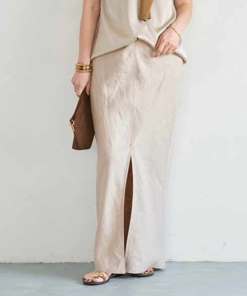リッチな雰囲気で着こなすOGLINENシリーズ。 着込むほどにラフな風合いがこなれたムードを醸します。 生地をバイアスにカットすることで自然な落ち感が生まれ、身体に程よく馴染じみ女性らしいシルエットが美しい1着。 前後の長めに開いたスリットは足捌きを軽快にするとともに、女性の美しさをより引き立てます。 バイアス仕様のため自然にスリットの生地が重なり合い、スリットの深さも気にならず、さりげない艶っぽさを演出。 フラットなサンダルでも様になり、涼しい穿き心地も魅力。 同素材のシャツとのセットアップに少しゴールドアクセを利かせたリッチなスタイルがお勧め。 ********************* 透け感:なし 裏地:なし 伸縮性:ややあり 光沢感:なし 生地の厚さ: 薄手 ********************* 【スタッフ着用コメント】 《STAFF.H》 40代前半/身長:153cm/体型:普通/普段サイズ:S/着用サイズ:34 サイズ感:ウエスト周りはすっきりしたデザインでヒップラインは体に沿うシルエットが綺麗なスカート。 素材感:程よいハリのある柔らかなリネン素材。着ていくうちに馴染みがでます。 着心地:バイアス仕様のため、やや伸縮性を感じ穿き心地もとても良いです。 ********************* ●同シリーズでこちらもご用意しております。 26010500412010:OGLINEN COVERALL ジャケット 26010500414010:OGLINEN ベスト 26050500410010:OGLINEN シャツ 26060500409010:*OGLINEN タイトスカート ※今後販売を予定しております 26030500419010:OGLINEN Wタックパンツ 26030500418010:*OGLINEN ハーフパンツ ※繊細で柔らかな素材の為、ホームクリーニングの際も優しく手洗いしてください。洗濯や着用を繰り返すと、生地が伸びたり歪んだりしやすくなります。洗濯機での脱水はお避け下さい。 ※バイアス生地を使用しているため、洗濯や着用を繰り返すと、生地が伸びたり歪んだりしやすくなります。予めご了承下さい。 ※こちらの商品は麻の特性上、表面に線状の節(ふし)やネップ(糸の塊)が見られる場合がございます。天然素材特有の風合いであり、麻本来の質感としてお楽しみください。 ※取り扱いについては、商品についている洗濯表示にてご確認下さい。 ※照明の関係により、実際よりも色味が違って見える場合があります またパソコン・スマートフォンなどの環境により、若干製品と画像のカラーが異なる場合もございます。 ※商品の色味は、商品アップ画像をご参照ください。 ※こちらの商品はお一人様1カラー・1サイズにつき1点までの購入とさせていただきます。 本体:手洗い可能