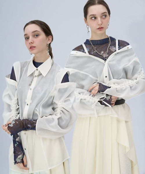ーーー マルチWAYで着れる万能シアーシャツ ーーー point □その日の気分やシーンに合わせて様々な着こなしが楽しめる万能シャツ ・内側の肩紐を出して、オフショルで女性らしく抜け感のあるスタイルに ・肩部分のボタンの開け閉めでさりげない肌見せを楽しめる ・フロントを全開にして、冷房対策や日除けのカーディガン代わりに ・肩部分から腕を出してノースリーブで温度調節が可能 □袖に絞りがついているデザインで袖丈の調節ができ、気温に合わせて着用できる □接触冷感素材で暑い夏でも快適に着れる □やや透けの素材の為、露出感が多くなく着やすい □接触冷感とイージーケア機能ありの生地を使用し、快適に着用できる styling 骨格ナチュラル:カットアウト部分からシアートップスをレイヤードするとこなれ感が出てオススメ。ワイドパンツを合わせて緩さを出すと抜け感が出ておしゃれな印象に。 骨格ウェーブ:袖のドローストリングを絞って袖のボリュームを強調し、オフショルで合わせると女性らしさが出てオススメです。ティアードスカートや、ハイウエストのマーメイドスカートと相性◎ 骨格ストレート:羽織りで着るとIラインが強調されてスッキリ見えます。インナーはシンプルなVネックのキャミソール、ボトムスは広がりすぎないタイトスカートやセンタープレスのスラックスがオススメ。 ※加工を施した画像を使用しております。 実物と色味が異なる可能性があるため、色味は詳細後ろにある生地寄り画像を参考にお願いいたします。 あらかじめご了承下さい。