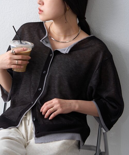 レイヤード風で着太りしない! 透け感がお洒落度UP!1枚でコーデが決まるこなれアイテム◎ ■デザイン レイヤード風デザインが1枚でコーデを完成させてくれるシアーカーデ。 裾や袖口、首まわりからさりげなく覗く配色デザインがアクセントになり、 レイヤード風のドッキングデザインなので、重ね着による着太りも解消してくれます。 程よい透け感のシアー素材で、春夏にもピッタリな雰囲気。 前を開けて羽織りにも使える為、日焼け・冷房対策にもオススメです。 ゆったりとした身幅に対しコンパクトな着丈で、トレンドのワイドボトムとも相性抜群。 カジュアルなお出掛けにはデニムやスウェットパンツ、 きれいめな気分にはロングスカートやスラックスになど幅広い系統に馴染みます。 ■スタイリング キャミソールやタンクトップの上にさらっと羽織るだけでレイヤード不要! 上下ボタンの開け具合を変えて抜け感を出すのもオススメです◎ また、前を全部開けて着れるのでコンパクトTやキャミワンピの羽織にも使えます。 綺麗めからカジュアルまでこれ1着な万能トップスです。 ■お手入れ方法 洗濯:液温は40 ℃を限度とし、洗濯機で非常に弱い洗濯ができる アイロン:底面温度120 ℃を限度としてアイロン仕上げができる タンブル乾燥:不可 ・・・・・・・・・・・・・・・・・・・・・・ 透け感:あり 裏地:なし 伸縮性:なし 光沢感:なし 生地の厚さ:薄手 ・・・・・・・・・・・・・・・・・・・・・・ ▼気になる商品をお気に入り登録 ハートをクリックして《お気に入り登録》がオススメです! 入荷情報や、クーポン情報が通知されるようになります。 ※画像の商品はサンプルを使用しております。実際の商品と若干の仕様が変更になる場合がございますので、予めご了承の上ご注文くださいますようお願いいたします ※屋外の光や照明の当たり具合で、実際の商品の色味とカラー別画像の色味に若干の違いが発生する場合がございます。詳細画像と併せてご確認の上、ご注文いただきますようお願い致します。 ※独自のタイムセールなどの施策により、実店舗と価格差が発生する場合がございます。 ※実際の店舗在庫につきましては、各店舗に直接お問い合わせください。
